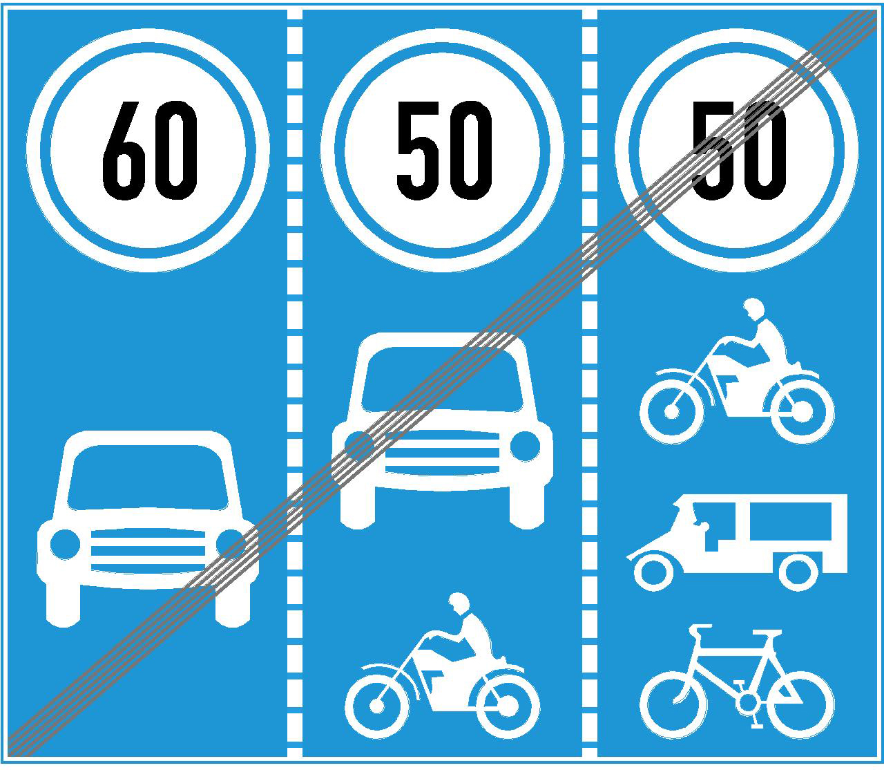 | P.127c | Biển ghép tốc độ tối đa cho phép theo phương tiện, trên từng làn đường | Các loại phương tiện | Không cấm | Phải đi đúng làn đường và tuân thủ tốc độ tối đa cho phép trên làn đường đó. | |||